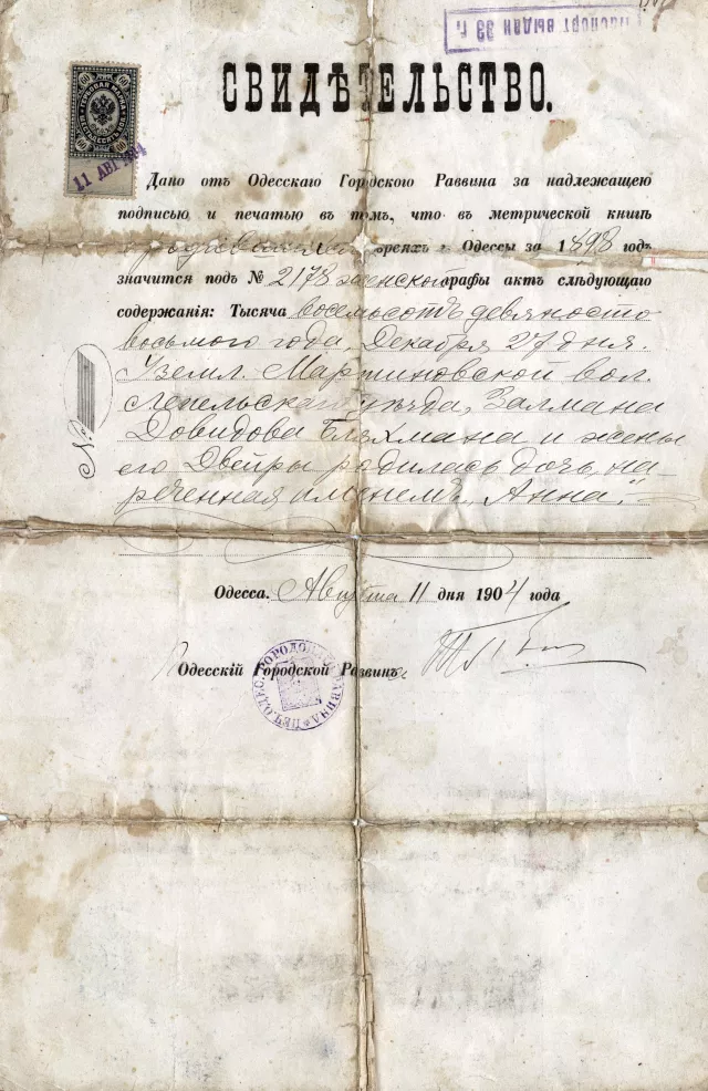 This is an excerpt from my mother Anna Erlihman's birth roster certified by the rabbi of Odessa town. This excerpt was made in Odessa in 1900.