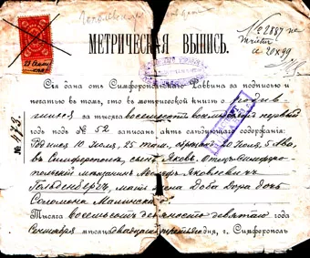 Issued by Rabbi of Sevastopol eparch duly signed and stamped stating the following in the birthday record of Sevastopol Jews: deed fi 52: Son Jacob was born on 10 July, circumcised on July, 5 1881 in Simferopol.