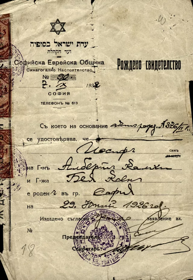 This is the birth certificate of my husband. Josif Kamhi was born on June 29, 1926, in Sofia. The document was issued by the Jewish Municipality in Sofia. We met in 1943 when we were interned in Kiustendil. We married in 1950.