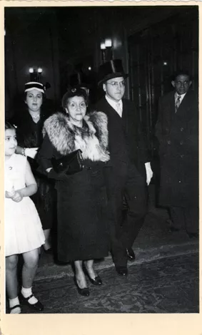 This is a picture of my brother-in-law Bonjour's wedding. It was taken when I, my mother-in-law and Bonjour were entering the synagogue. The little girl next to us is my daughter. My father-in-law was deceased when Bonjour was married, I held the thallis.