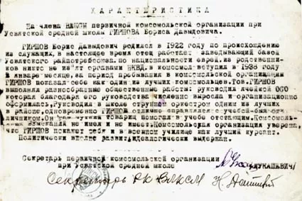 This photograph shows a reference received by me from the school Komsomol organization in Usvyaty in 1940.