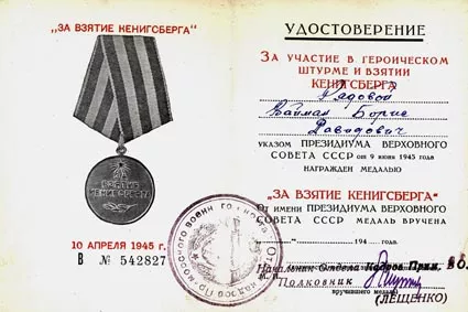This photograph shows my certificate I received for the Medal for the Capture of Konigsberg. I was at the Belarus front-line and took part in liberation of Lithuania.