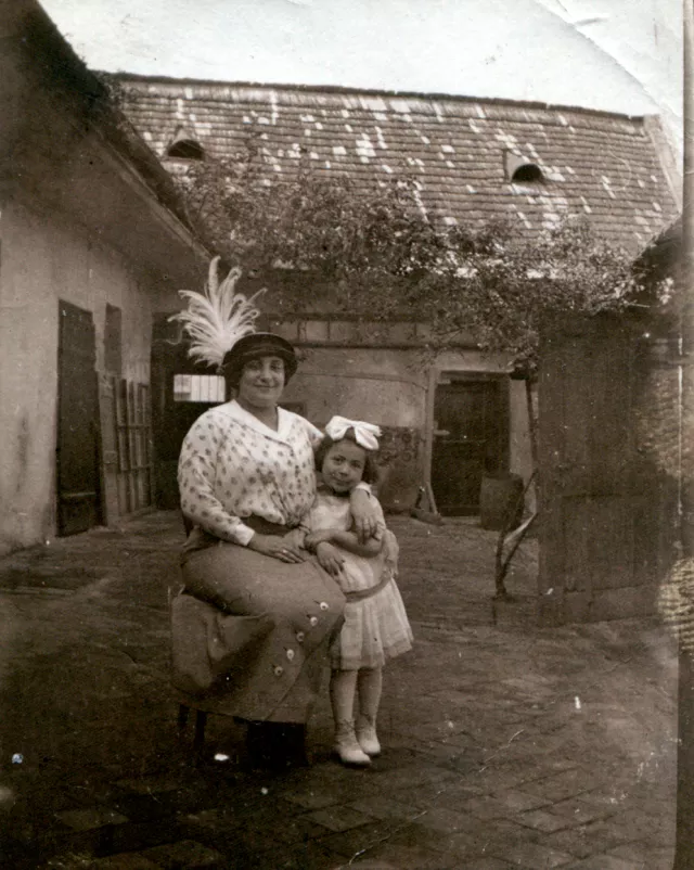 Boske [the adult woman] and my mother [the child] are in this picture. My mother is a bit older here. This must have been sometime around the outbreak of World War I. or before. I guess that this picture was taken at Boske's house, in the yard. There was the family house. Boske was the child of a third great-aunt of mine, the daughter of the eldest sister of my grandmother. Her father was a shoemaker; her mother didn't have a job. Boske became an official. Her husband, uncle Bela, was an electrical technician in a factory in Temesvar. He participated in World War I, and I heard from him the name Doberdo for the first time. The husband was also a Jew. They were the Grunfelds: auntie Boske, her husband, her daughter and her son.