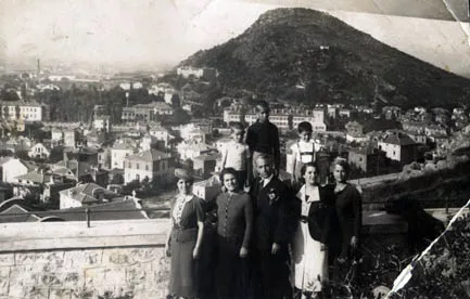 Plovdiv, 1936. On ‘Bounardzhik’ hill. On the photo from left to right are: Sofi, a neighbor of ours, my mother, Liza, pregnant with my sister Viky, my father Zhoudi, Tanti Rebeka (Zhoudi’s sister), Tanti Sofi (Zhoudi’s sister). The children are in the second row, from left to right: I, Sami (my brother) and my cousin Emil Vagenshtain. There is no stamp of a photo shop on the back of the photo, nor any other inscription.