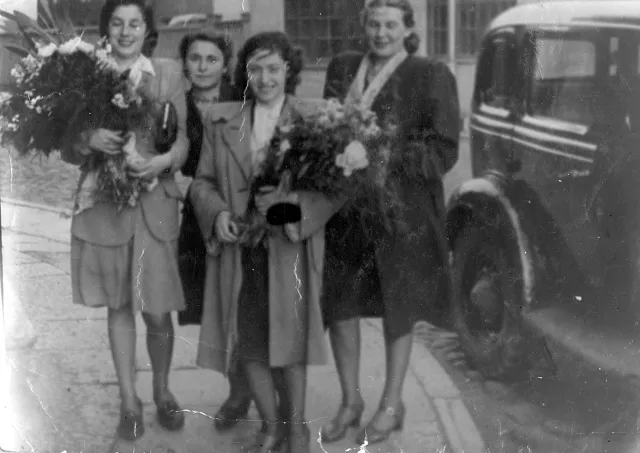 My mother is second from the right. First from the left is Valentina Ilyinichna Smolyan, whose husband worked on the editorial staff of the "Zvezda" newspaper; second from the left is Raisa Abramovna Sonkina (they both are Jews), and first from the right is Laura Alexandrovna Verolajnen, wife of the scientist N. Ya. Berkovsky.