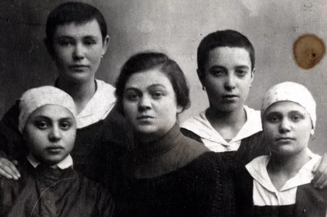 The Jewish children's home, Uman. All children have their hair cut short because of fleas. My mother Buzia Aloets (wearing a shawl) is at the bottom on the right. Photo made in 1923. Photo studio of Butelnokov. I have no information about the others on the photo.