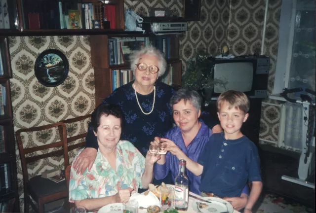 This is me and my family. This photo was taken in Kishinev in 2003. From left to right: my sister Tania's daughter Monique Fragoas, my daughter Tatiana Kasymova, my grandson Yevgeniy Kasymov. This photo was taken in my daughter's apartment on the occasion of Monique's visit.