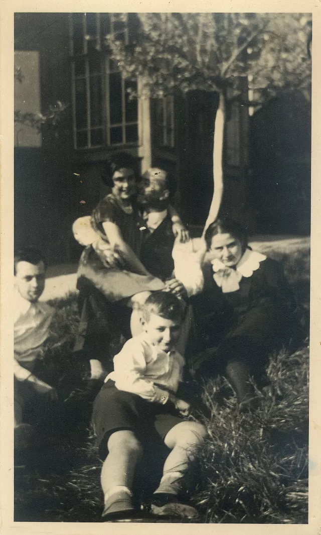 The picture was taken in the courtyard of our house in Czernowitz in the 1930s. Below, the first one from the left in the second row, it's me. My brother, Hary Margulies, is the one next to me, in front. To the right is Selma Meerbaum-Eisinger, our cousin related to us through my great-grandfather, Abraham Schrager. In the back row, in the middle, is a little girl whose name was Erica, held in the arms of her uncle; his name was Schrager and he had come from America. I was hardly related to them. They must have been third or fourth cousins from my mother's side of the family. Her grandmother was a sister of our Schrager grandmother. When this picture was taken, I was approximately ten.