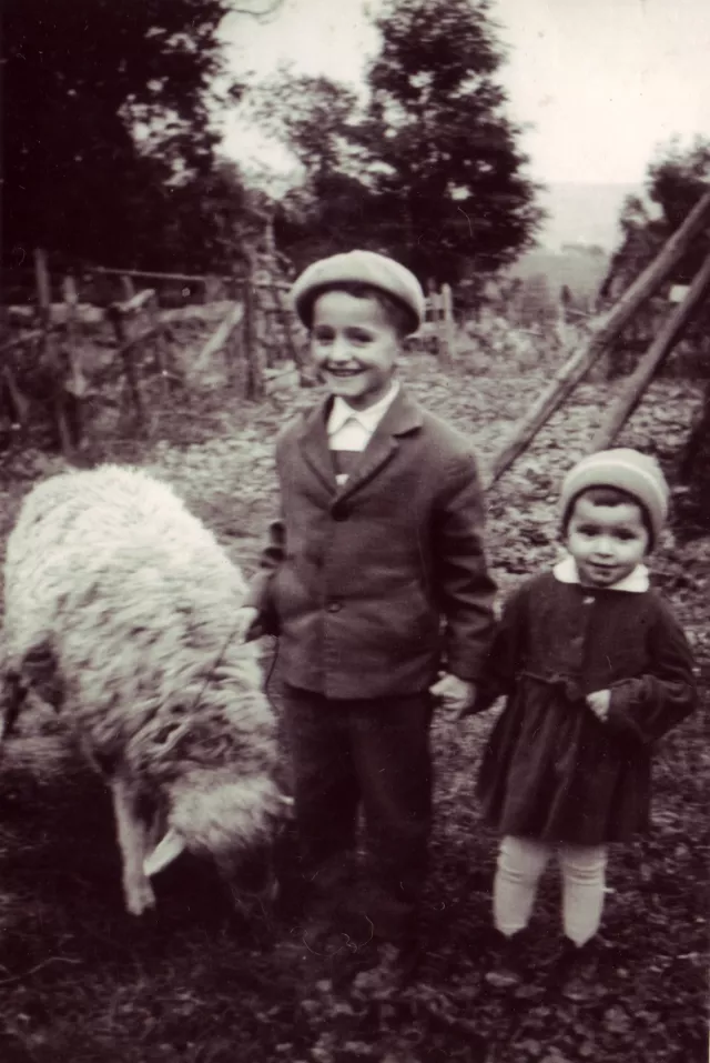 These are both of my children, Gustav and Carola Finkel. They took a photograph of them with a sheep. I think Carola was around 2 years old, so the photograph might have been taken around 1965, in the garden of our house.