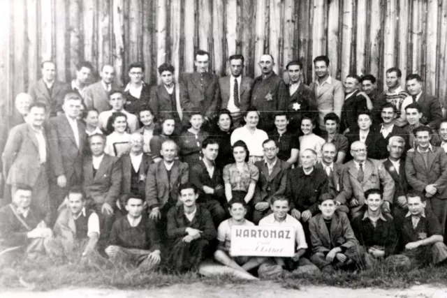 In this photo you can see the cartonnage workshop at the Novaky labor camp. I think that in 1943 a delegation from Bratislava came, and this photo was taken on that occasion. My brother was employed in the workshop as a cardboard maker, as we're from a book-printing family. They made him assistant manager of the workshop. My brother Ervin is in the first row, fourth from the left, in the middle of the second row, wearing glasses, is the workshop manager Mr. Werner with his wife. Second from the left is Mr. Bienenstock, a baker from Prievidza. The photograph was taken by the photo workshop of the Novaky concentration camp.
