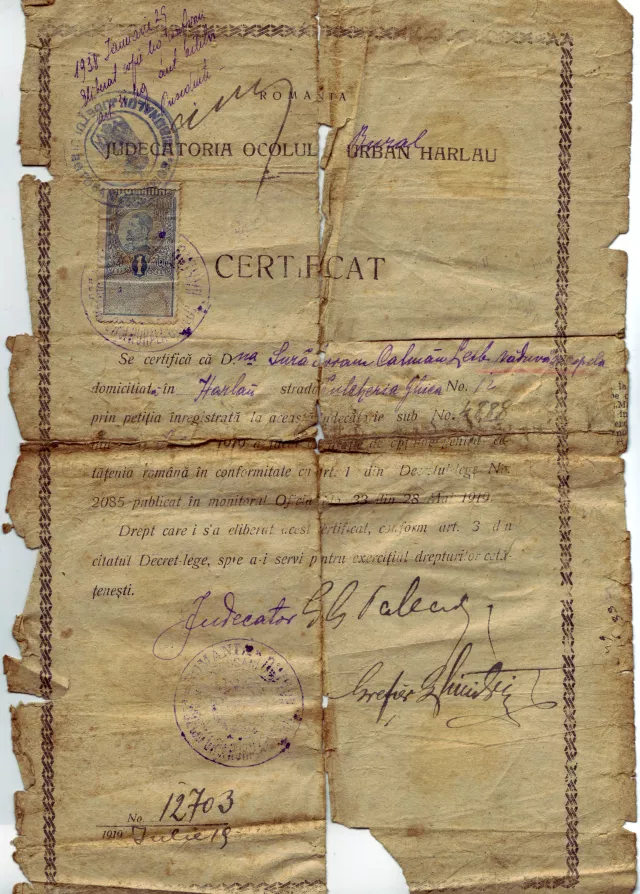 This is the certificate issued to my mother, Sura Avram Calman Leib - Sura Ghebergher -, by the Court of Law of the Administration of the Village of Harlau, whereby her rights as a Romanian citizen are recognized.