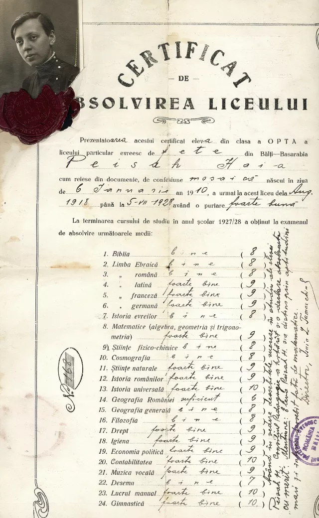 This is the certificate given to my mother Haya Peisakh after graduation from grammar school in the town of Beltsy in 1928.