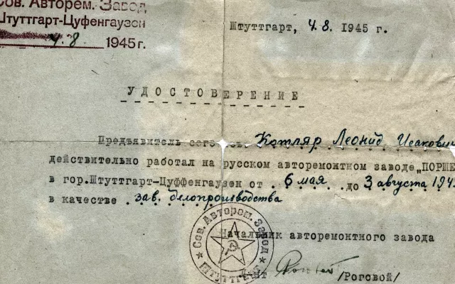 “Certificate. This is to certify that presenter of this Leonid Kotliar worked at the Russian car repair plant 'Porsche' in the town of Stuttgart, from 6 May through 3 August 1945 as document control supervisor. Chief of car repair plant Rogovoy.”