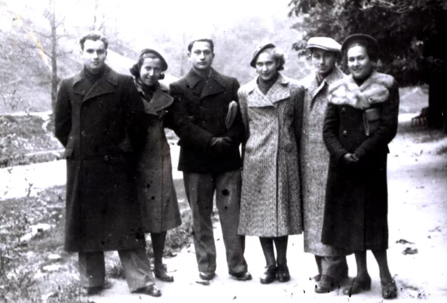 Young people from left to right: I don’t remember the name of the first guy, next to him is Gulka Jashunska (she was in evacuation during the war; died in Haifa), Deilovich (died in Israel), Masha Nemze, Israel Katz, and I, Chasia Langbord. The picture was taken during a stroll in Vilnius in 1938.