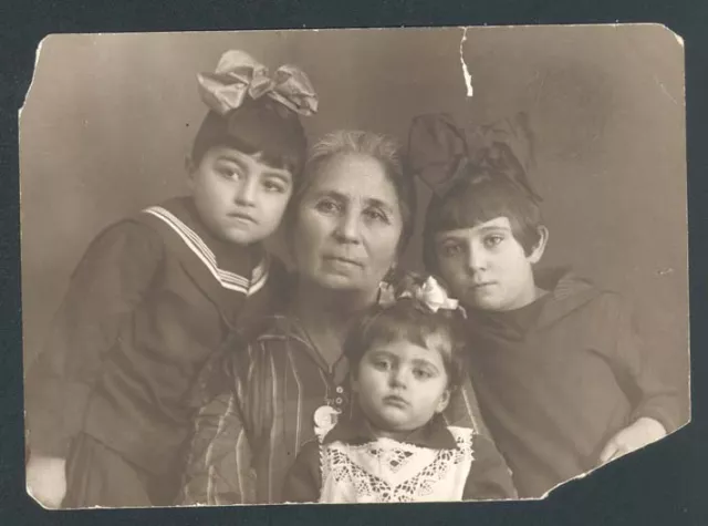 This is my mother Chasya-Ita Perlstein (second from left) in 1931 in Leningrad in my apartment with her granddaughters: Inna, my brother Iosif's daughter Inna (utmost left); Esfir (utmost right) and Irina in a dress with white laces (second from right), my brother Lev's daughters.