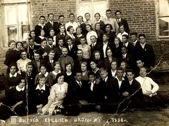 This picture was taken in 1938 in Roslavl after our public exams. This is our graduate class. I, Chaya Salhartova, am second from the left in the third row from above. We were all very glad that school had ended. Many of my friends can be seen in this picture: Raisa Ioffe is fourth from the right in the second row from above, wearing a white dress, Yakov Rubin is sitting second from right in the first row from below. The names of all our class-mates are written on the back of the picture. Now only two persons from the whole class are alive.