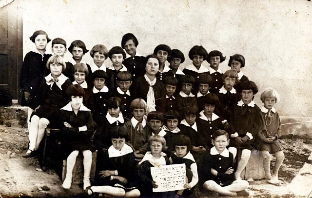 This is another class photo. It is hard to tell in which school in Goworowo it was taken. It had to be a Jewish school though, since the children in the front hold a sign with a Yiddish inscription. Personally, I did not enjoy my primary, Jewish education.