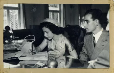 This is the photograph of my civil marriage. It is Beyoglu public marriage office. I am 17.5 years old. I was not declared an adult for 6 months after we had the civil marriage. My mother signed and we were civilly married. My dress is very light green, and I have a hat.