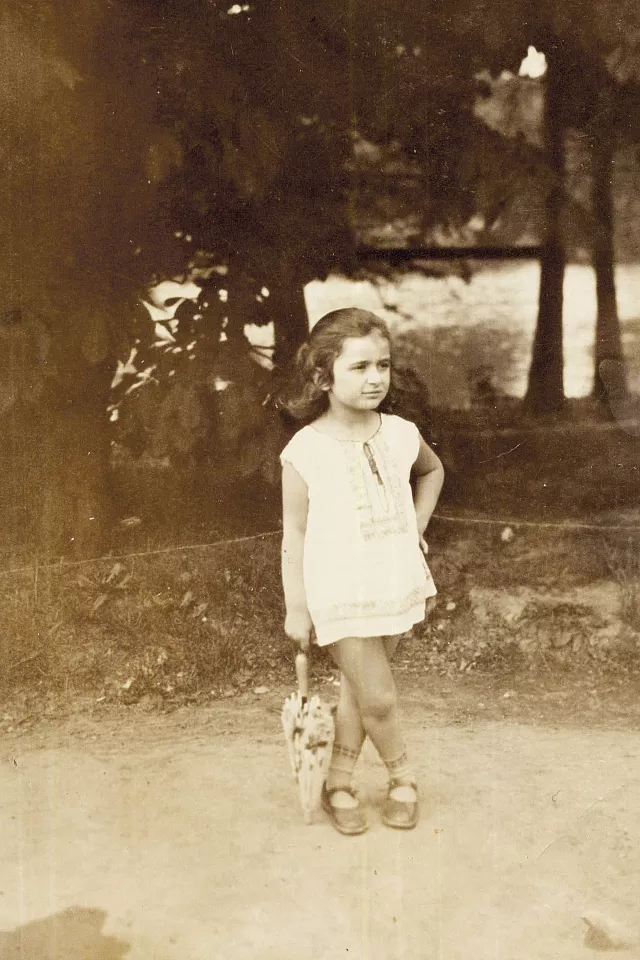 This is Clara Filderman, my sister, on 26th May 1929, in a park in Bucharest. On the back of the photo she wrote `To Mom, kisses from the Carol Park, Coca Lala`.