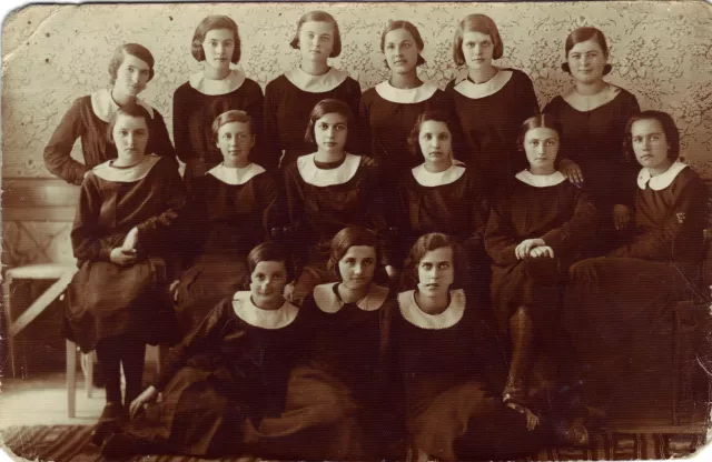 This is I, Marim Haller, with my classmates on graduating high school - The Superior School of Commerce, as it was called in those days - in 1934. I am the third from the right, second row. The one next to me on the right is Sarica Segall, the one to my left is Reghina Smilovici, Clara Turcu is the one on her left, the one sitting on the ground to the right is Otilia Gold, Farcasanu is sitting in the middle, and Marcus is on the left; in the back row, the one on the left is Tony Schwartz, the second and the third from the right are Alexandra Ianovici and Marioara Siminiceanu, respectively, they are Romanian - several of the persons in this photograph are Romanian. The back of the photograph reads: "The graduates of 4th grade 1934. 4th June 1934," and we signed our names: "Reghina Smilovici, Malvina Sin Soil, Tony Schwartz, Turcu Clara, Rozica Grimberg, Ianovici Alex, Gold Otilia, Segall Sarica, Siminiceanu Marioara, Grigoras."