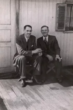 This picture was taken in 1944 on coal pontoon No. 3 in the Bratislava harbor. Sitting on the left is my father, Julius F., and beside him is Mr. Zatko, with whom we were hiding from the deportations at the time.