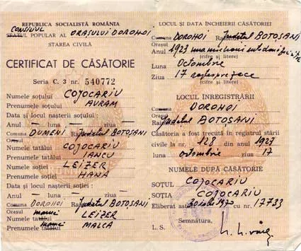 This is the marriage certificate of my parents, Avram Cojocariu and Hana Cojocariu, born Leizer. They got married here, in Dorohoi, on October 17, 1923. But this isn't the original document, for it was issued in 1970.
