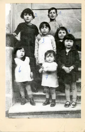 You can see all the girl cousins in this photograph.  It was taken in Bursa, and these are all the cousins on my mother's side.  On the stairs.  Just across our house.  The house of the Abravanel's.