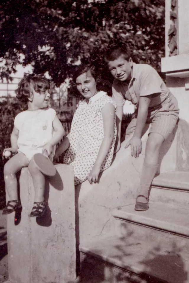 The photograph was taken in the summer of 1930, in front of our house in Bucharest. From right to left: my first-degree cousin, Marian Solomon, my sister, Mira Cotin [nee Mizrahy], and me, Dan Mizrahy.
