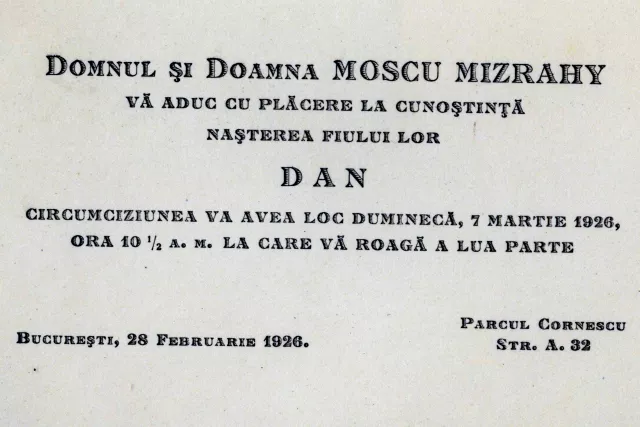 This is an invitation to my circumcision ceremony. I quote: 'Mr. and Mrs. Moscu Mizrahy are glad to announce the birth of their son, Dan. The circumcision, which we invite you to attend, will take place on Sunday, 7th March 1926, at 10:30am. Bucharest, 28th February 1926. Cornescu Park, A 32 St. [now 1 Turbinei St.].
