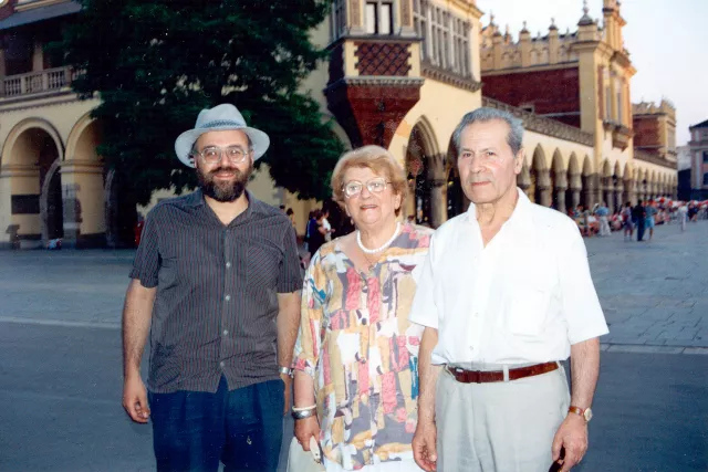 This picture was taken when Renata Zisman, nee Springut (in center) and me (first from right) were walking in the Market Square in Cracow and met Henryk Halkowski (first from left), a friend from the Jewish Community here.