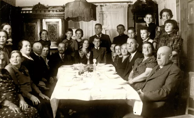 This is the family of my maternal grandmother, Grunya Grinberg. The picture was taken in the house of grandmother's sister Beila in Jurbarkas (6, Veit Street). Beila is the first on the right. Our distant relatives are in this picture, namely Daniel Melnik is sitting fourth from the left. His daughter married Mr. Rabinovich, the minister of finance of Lithuania. I don’t know about the rest. The picture was taken in the mid-1920s.