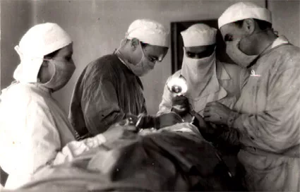This is me, David Wainshelboim, photographed with my team during an operation. I am second from left wearing a mask, beside me my is colleague Aleksandr Shepelev, Kishinev, 1950s.