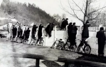 This is a very funny picture. Andris kept it because he liked it very much. It shows some people watching a soccer game. This picture was probably taken before the war. Everyone wore a cap, as if they were forced laborers or soldiers, they wore these army-type caps.