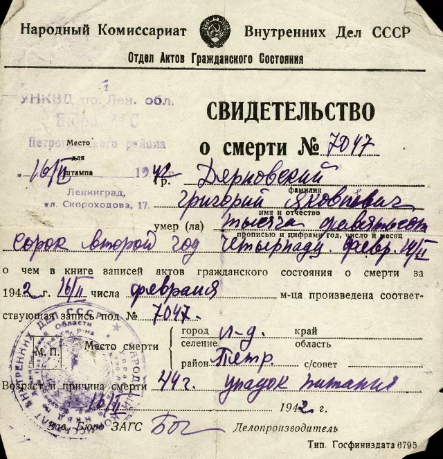 The death certificate of Grigory Dernovsky, Mira Dernovskaya's father