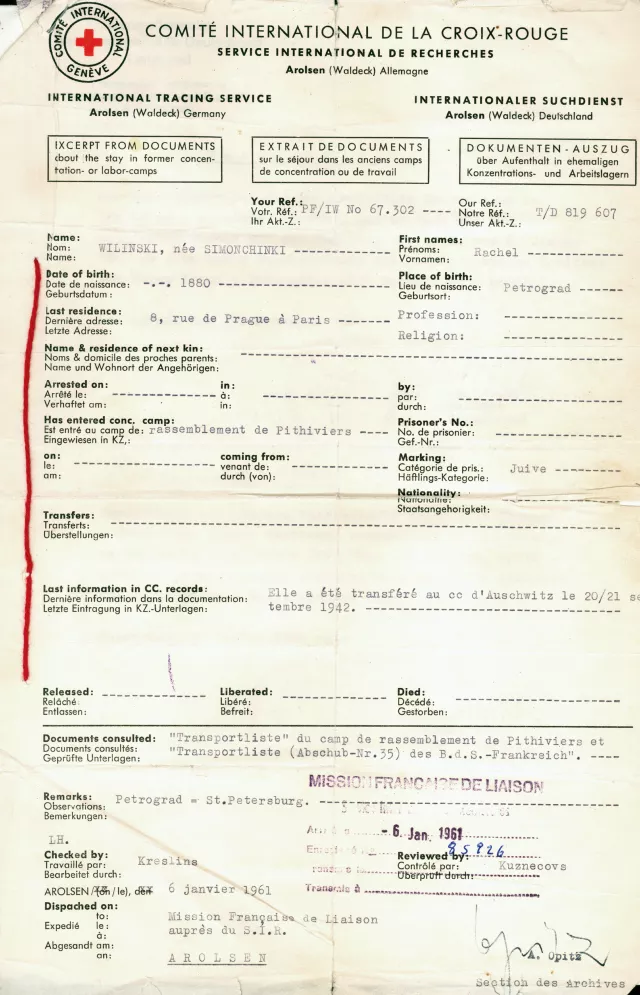 "Ñombined in Pitivye" with a "Jewess" category (brand) and was transferred to Auschwitz (Osventsym) concentration camp on 20-21st September 1942.