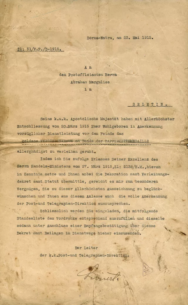 This is a letter dated 26th May 1915 in which the Seletin Post Office and Telegraph Department congratulates post officer Abraham Margulies for the decree awarded by the Emperor of Austria-Hungary on 20th March 1915 and for the order issued by the Minister of Trade on 27th March 1915.