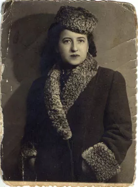 This is a photograph of my wife Devora Finchelstein. I think it was taken around 1944-1945. She had bought a piece of fur for her collar from Dvoire, a dressmaker, and she made herself a great coat from an old blanket. Back then people used to have their photograph taken whenever they made new clothes for themselves.