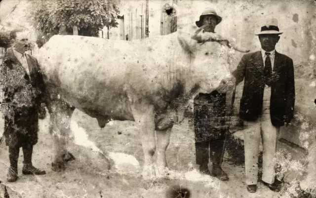On the left in the picture that's my father, Dezso Eisikovits, while on the right side that's Samu Teleki, my father's business partner, while behind the ox there's an employee.