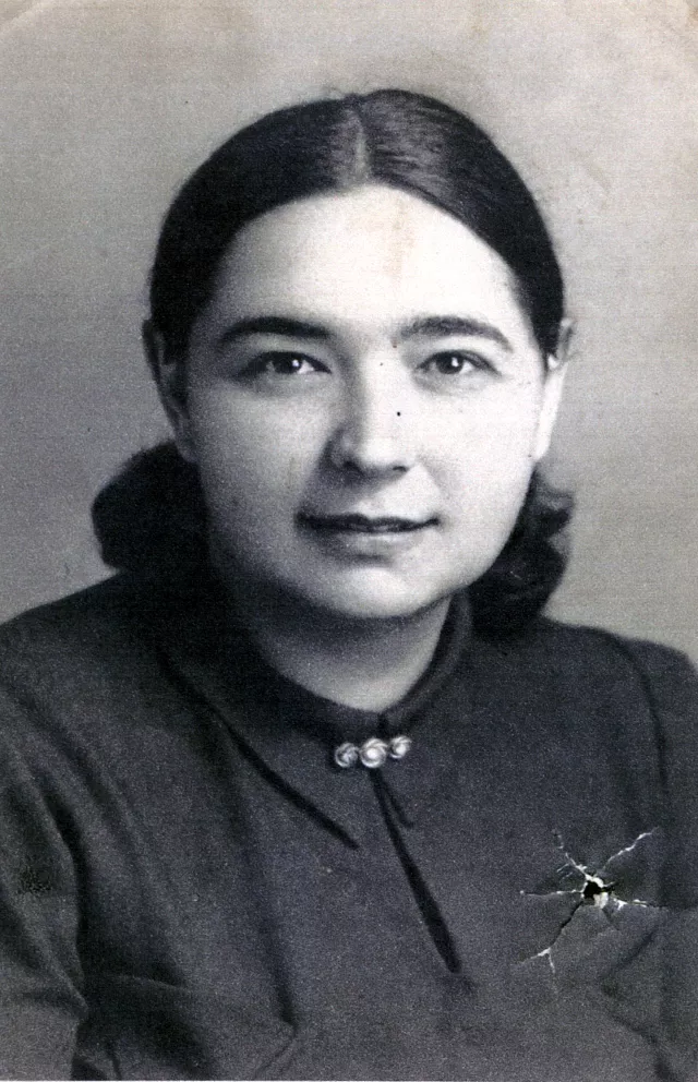 My mother, Olga Kamyshan, in 1940 in Kharkov. She sent this picture to me when I was at the front. This picture saved my life. I always kept this photo with me in my chest pocket. I was wounded during a battle near the village of Poltavka, Nikolaev region. I was wounded on my left hand first, and then something hit me on my chest. I didn't understand at first what it was, but in the hospital the doctors found out that it was a bullet that hit my mother's photograph leaving a bruise on my chest. It would have killed me if it hadn't been for my mother's picture.