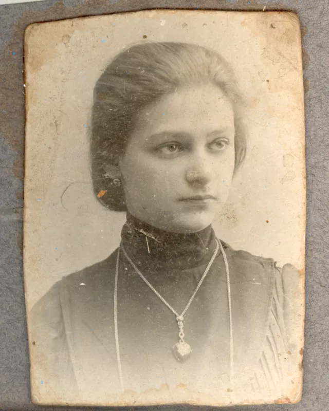 This is my grandmother Dinora Gdalievna Dombrovskaya. The photo was presumably taken in the 1900s in Tomsk, after she finished the grammar school. She was a girl of strict rules, and dressed accordingly. The high neckline in this picture testifies to this. Aspiring to find her own road in life, she moved from Tomsk to St. Petersburg, where she entered and successfully graduated from the Medical Institute.