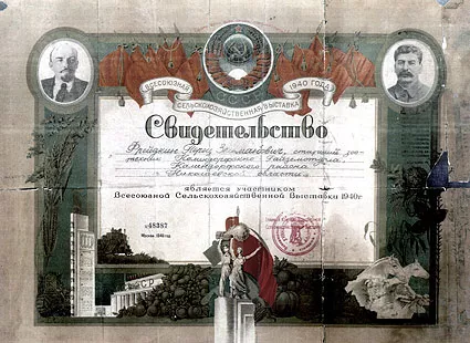 A diploma issued at this exhibition to my husband: 'This certificate is issued to Freidkin, Peretz Zalmanovich, zootechnician of the Kalinindorf district department, participant of the All-Union Agricultural Exhibition in 1940'.