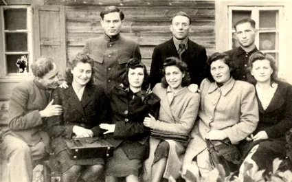 This picture was taken upon my return from the concentration camp, in Jurbarkas by our house in 1946. My husband is standing first from the left, then our friends Leizer and Bobke. They died in the 1980s. I am sitting first from the left. I don’t remember the rest. Almost all Jurbarkas Jews, who survived the war, got together in this picture.