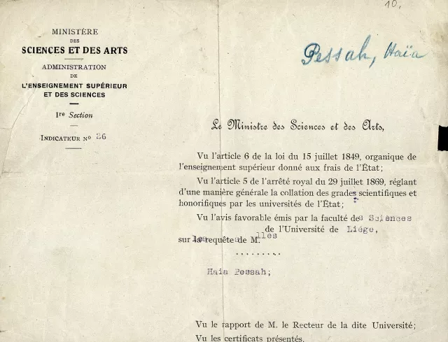 This is a document given to my mother Haya Peisakh by the Ministry of Sciences in Liege, Belgium, when she planned to continue study in France in the 1930s.