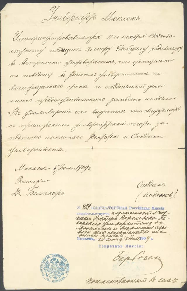 This document was given to my grandfather, Iosif Raitsykh by the Russian Mission representing Imperial Russia in Munich, namely by its secretary, Count Barbozin, on 11 November 1908, confirming that student Iosif Raitsykh is identical to student Abram Iosif Lazarevich Raitsykh, for whom he gives himself out. The certificate bears the university seal and is signed by the rector of the university, Dr. Bolenger.