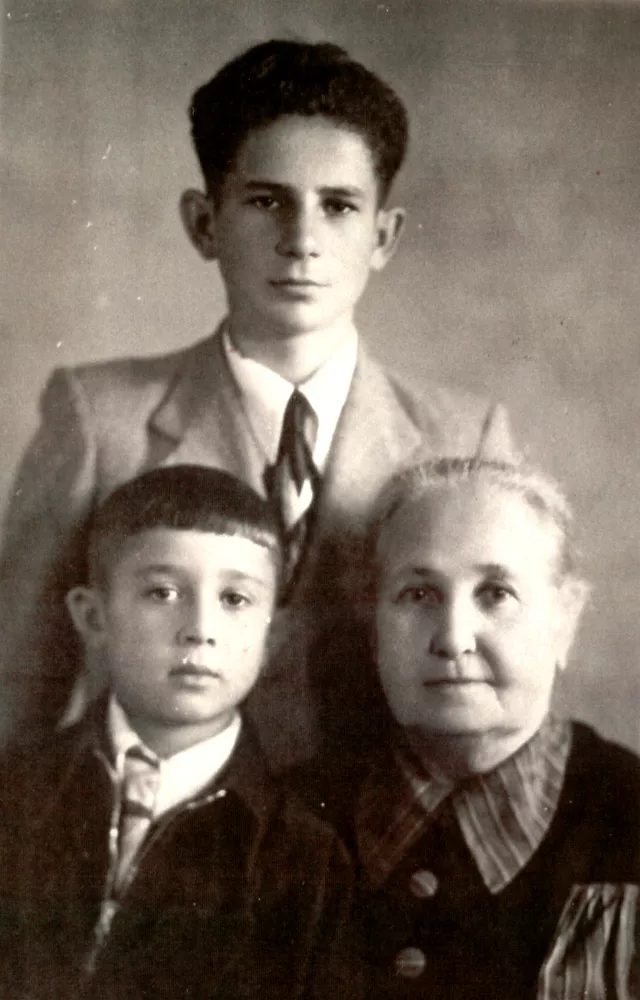 This is my paternal grandmother Riva Gitman with her daughter Bertha's children: Michael, the older one standing, and the younger Yakov Geller. This photo was taken in Zhmerinka in the 1950s on the occasion of her grandchildren visiting her.