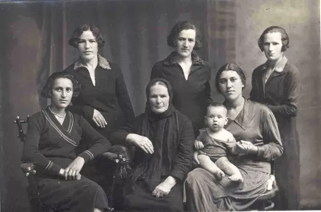 In the center sits my grandmother Dveira Chaimovna Frumkina; in the bottom row from left to right sitting: her granddaughters Chasya and Zhenya with her son; in the top row from left to right standing: Dveira Chaimovna’s daughters - Pesya, Chasya and Zhenya.