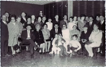 This is my sister, Edna Sinai, with her husband, Max Sinai, at the wedding of some relatives from Israel. The one on the left is my brother-in-law, and my sister is on his right. I don't know the other people in the photograph. I couldn't tell who they are. The text on the back reads: 'Haifa, To remember Jacob's wedding by, my brother-in-law Eri and the Max family. Emilien Ubermann.' I don't know, I don't know them, they were probably acquaintances or even relatives of my sister's husband.