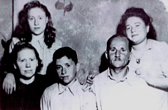 This is our family photograph taken shortly before the war. From left to right: sitting, my mama Hana Greenfeld, my brother Boris Greenfeld, my father Hershe Greenfeld. My sister Joheved is standing on the left, I am on the right. This photo was taken in Riga in 1941. This is a copy of the photo that I've made for myself. My sister has the original in Israel.