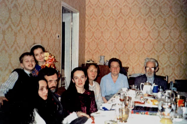 This photo of our family was taken shortly after I returned from Israel in 1996. This was my first trip to Israel. I went there for my brother’s wife's 60th birthday. I returned home before my 70th birthday. My dear ones came to greet me. First from the right is my husband Iosif Perlman, and I'm on his left. Sitting from left to right: my older daughter Bertha Tzelmale, her husband Andris Tzelmale, my younger daughter Yevgenia Perlman and Vera, my school friend's niece. Standing: my younger grandson Bertha's son Robert and granddaughter Anna, Yevgenia's daughter. This photo was taken in our apartment in Riga in 1996.