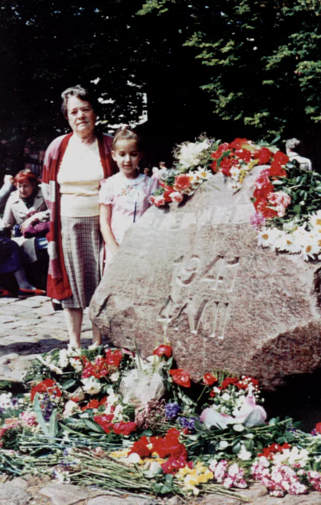 This is me with my granddaughter Anna. Each year, on 4th July, the Memorial Day for Victims of the Holocaust, I visit the memorial, installed on the site of the choral synagogue of Riga, burned down by the Germans. On 4th July 1941 Germans locked a number of Jews inside the synagogue and burned it. Every anniversary of this horrific event I bring flowers to this place of death and recall my dear ones, killed by the Fascists. This photo was taken in Riga in 1994.